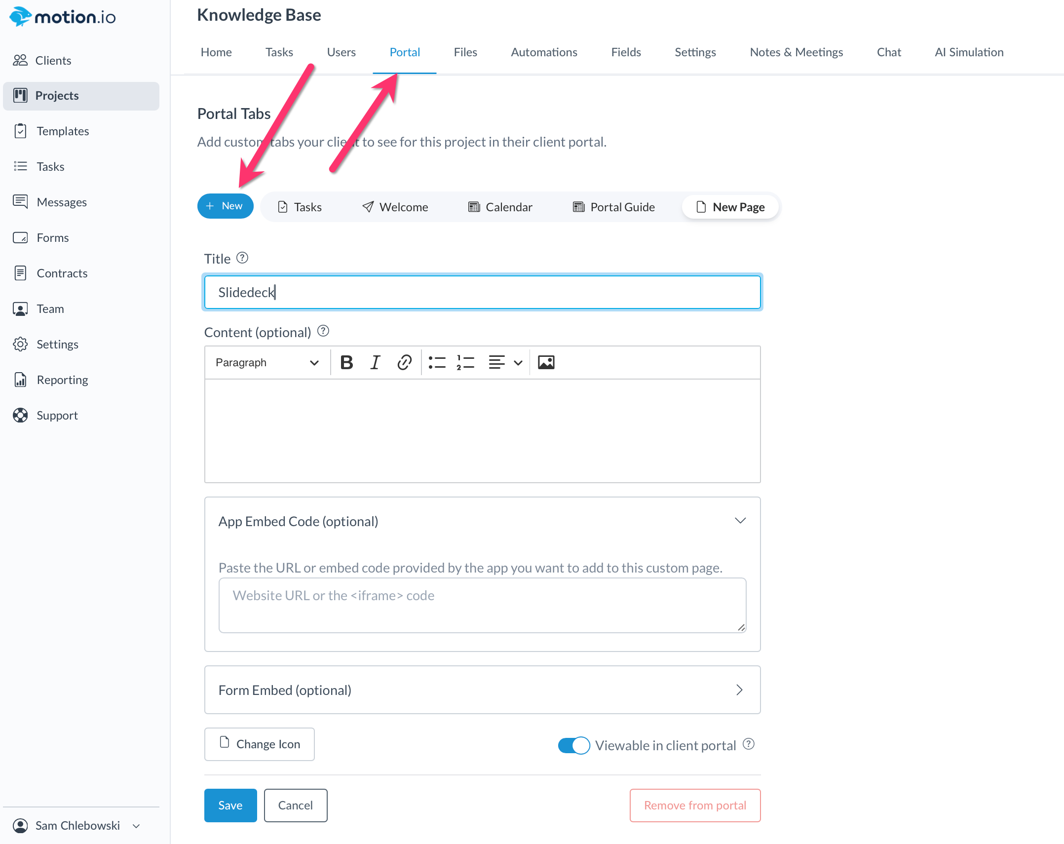 In your Motion.io account, select the project you’d like to add the Google Slides presentation to, click “Poprtal,” and then “+New” to add a new tab page.