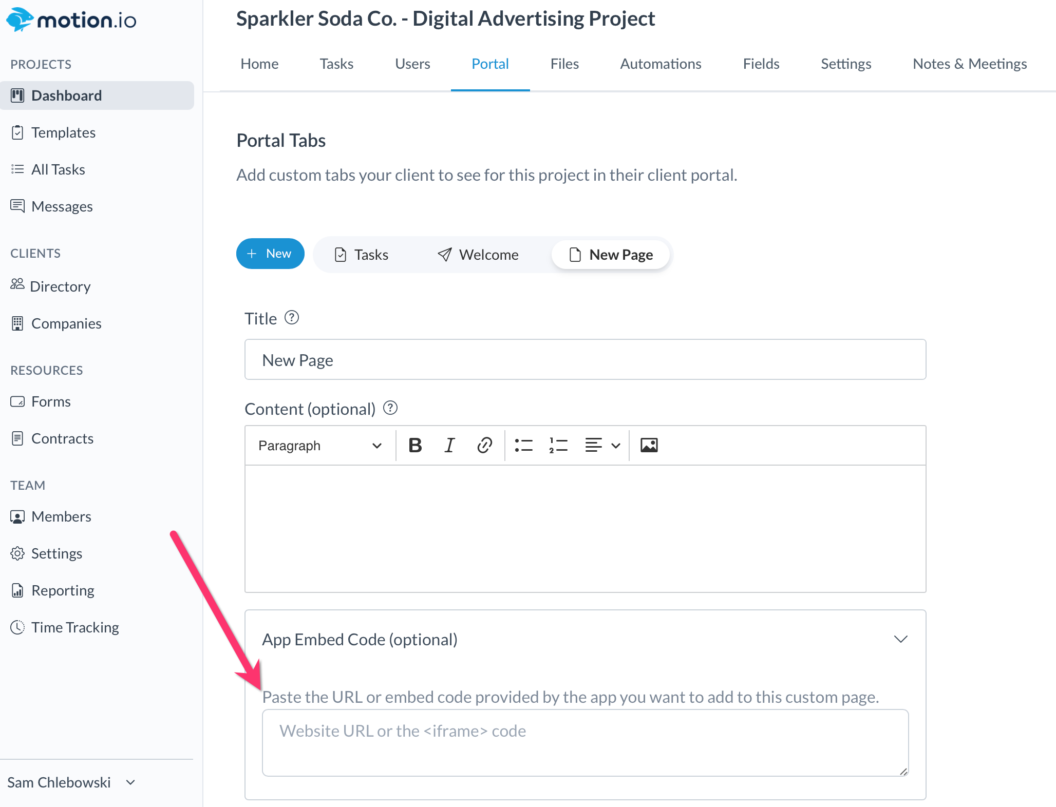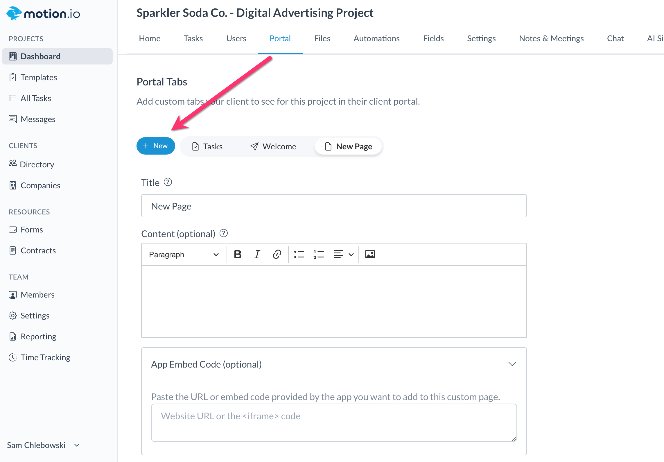 In your Motion.io account, select the project you’d like to add the Monday.com board to. Click “Portal” from the options at the top of your screen, and then click “+New.”