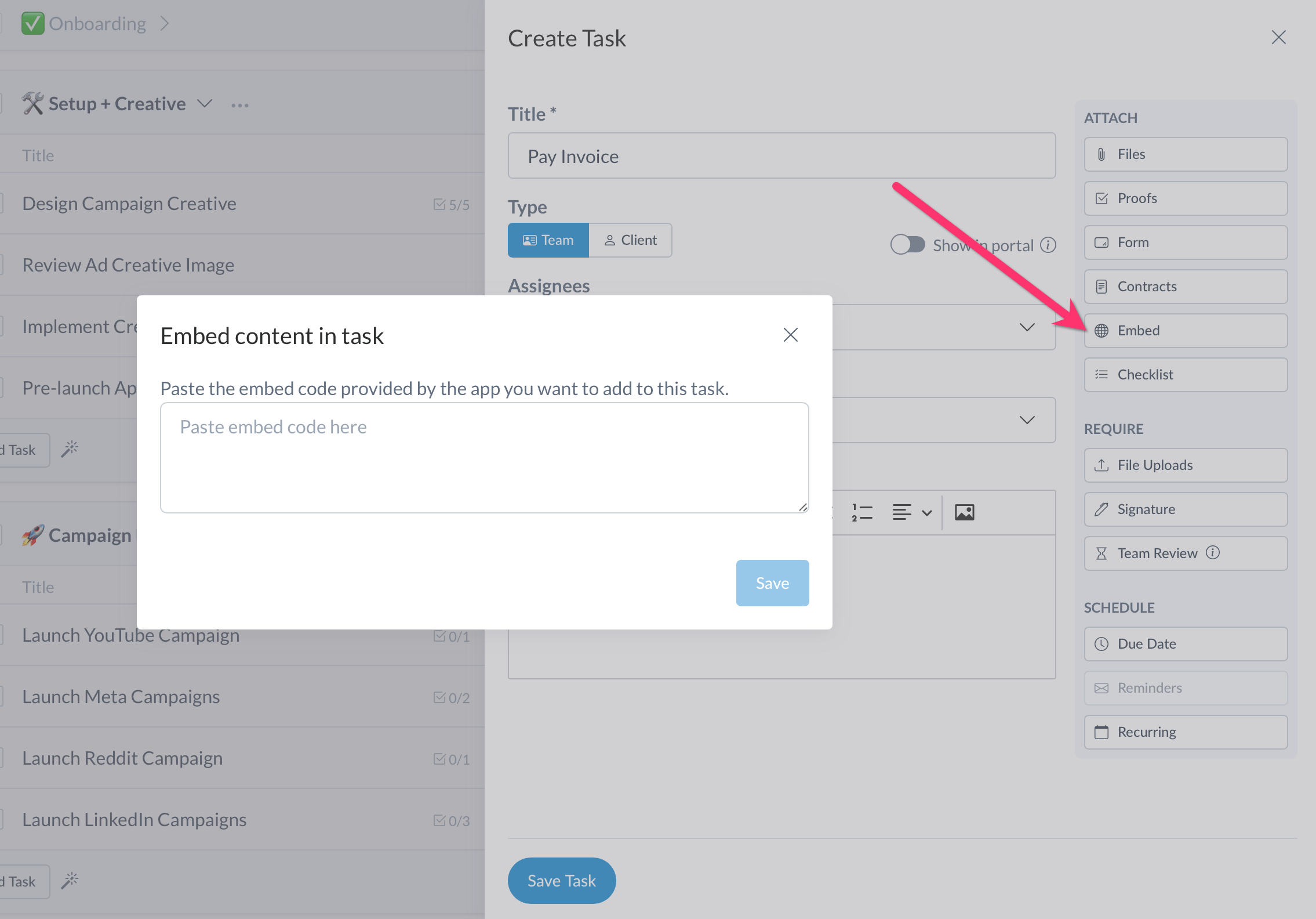 After entering a title (required) and description (optional) for your task, click the “Embed” task option.