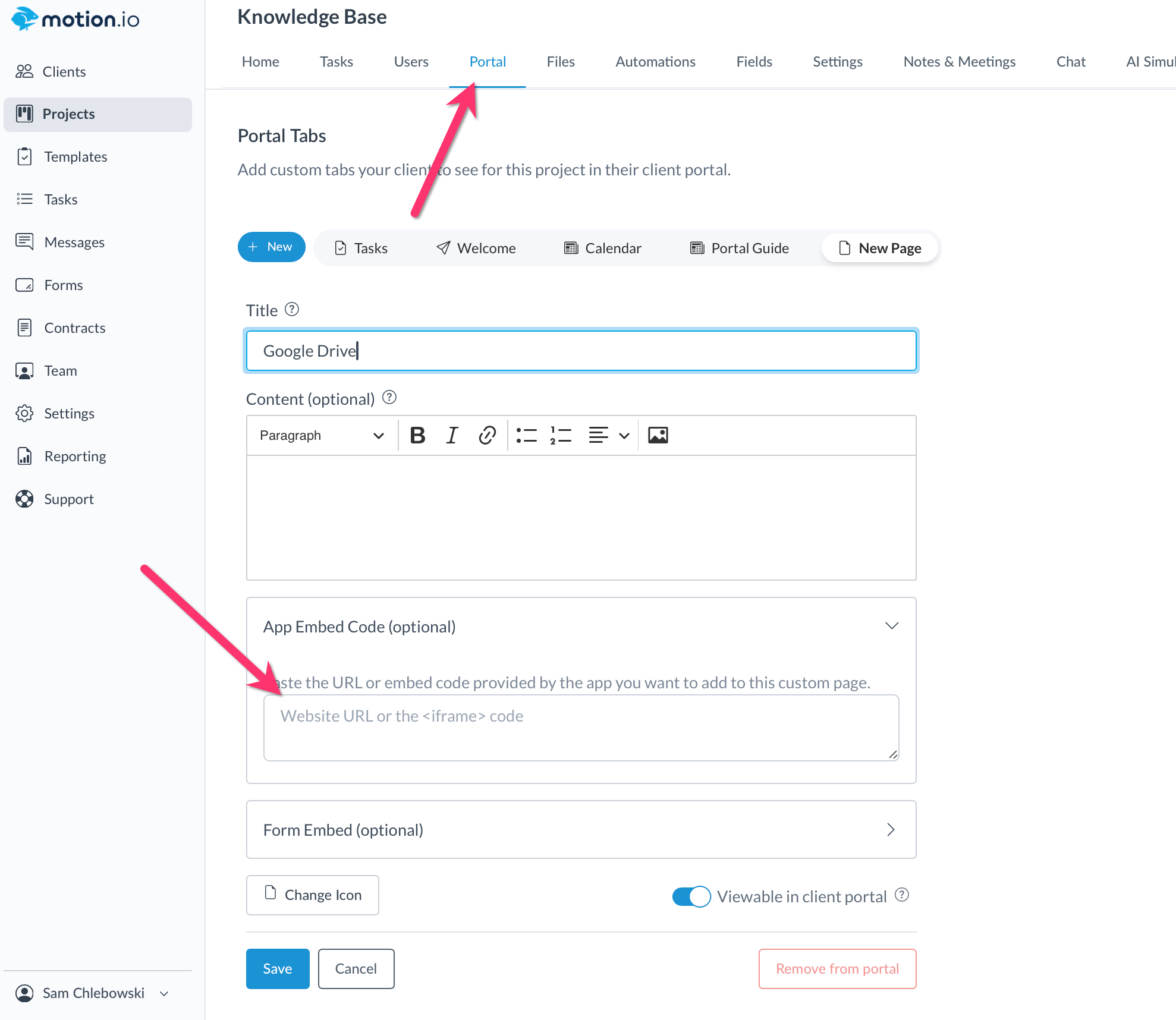 Select a project from your dashboard, click “Portal,” then “+New.” After entering a client-facing title for the page and choosing an icon to represent it, paste the code you copied from Google Drive in Step 1 into the “App Embed Code” box.