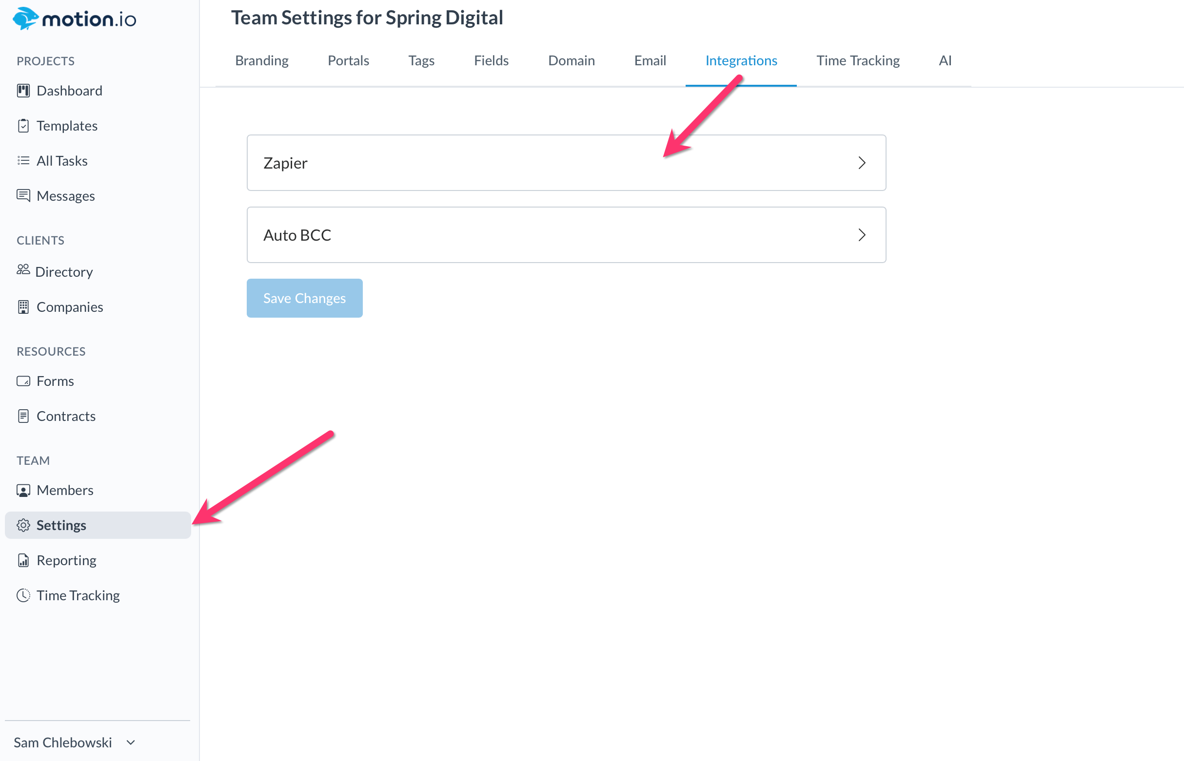 Log in to your Motion.io account and select “Settings” from the sidebar on the left. Then, click the "Integrations" tab and open the Zapier option