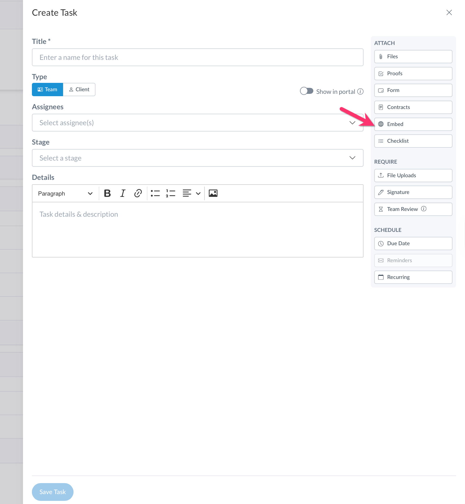 Enter a title for your task, and click“Embed” from the list of task options in the composer.