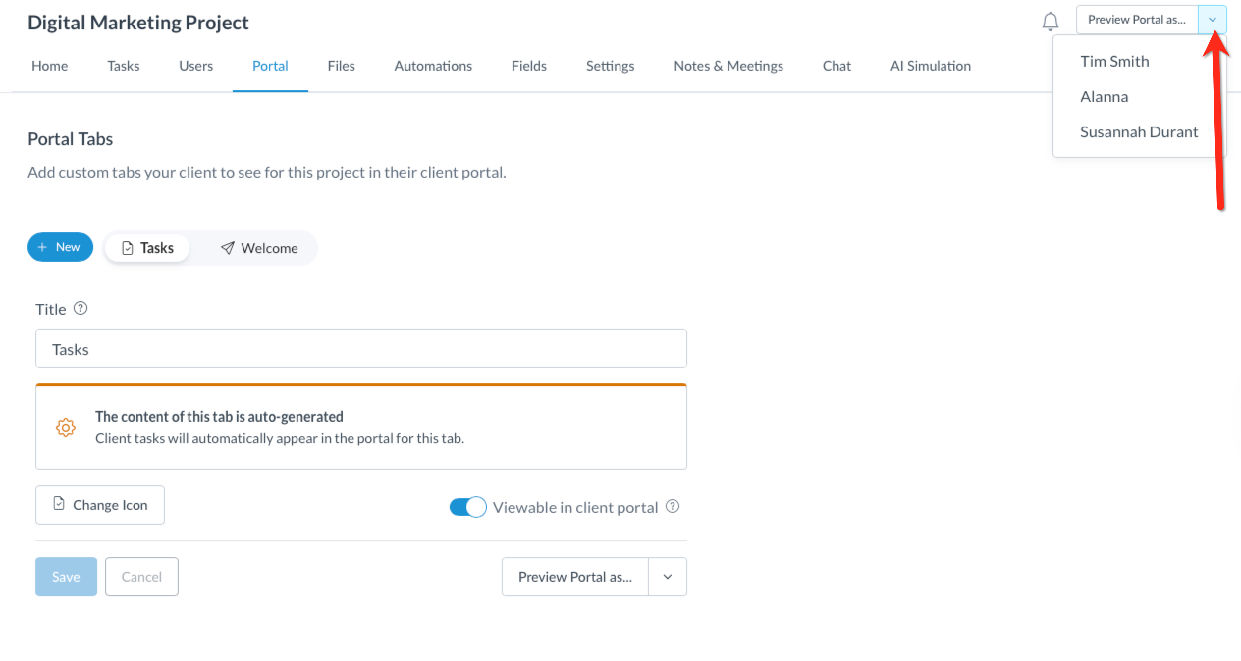 After saving changes made to a portal tab or tabs, click the arrow next to "Preview Portal as.." in the top right. This will open a list of clients on the project, allowing you to see a preview of how the portal and any custom tabs you added will appear to that client.