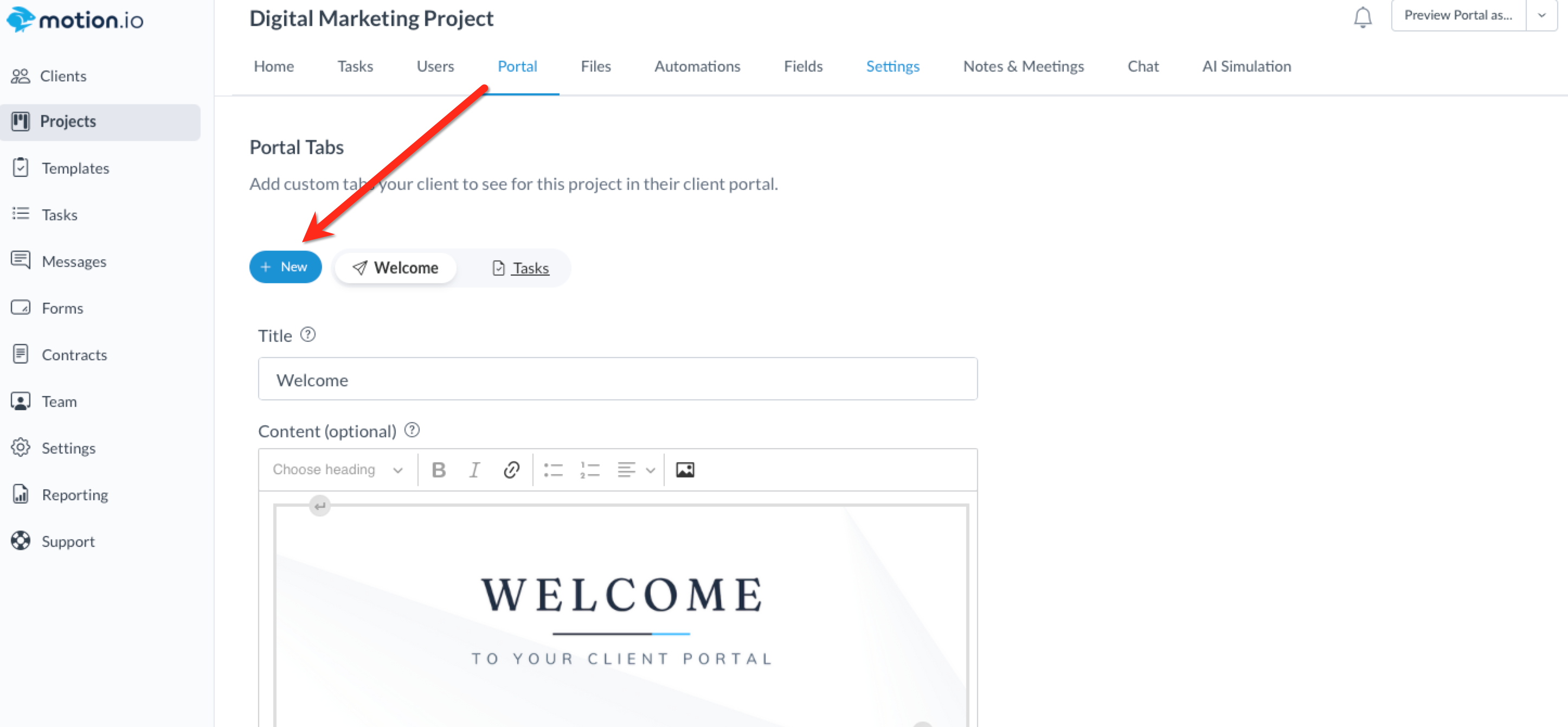 In addition to editing or removing the default tabs, Motion.io allows you to create new Portal Tabs to provide clients with access to static information or connected software applications they'll need throughout a project.