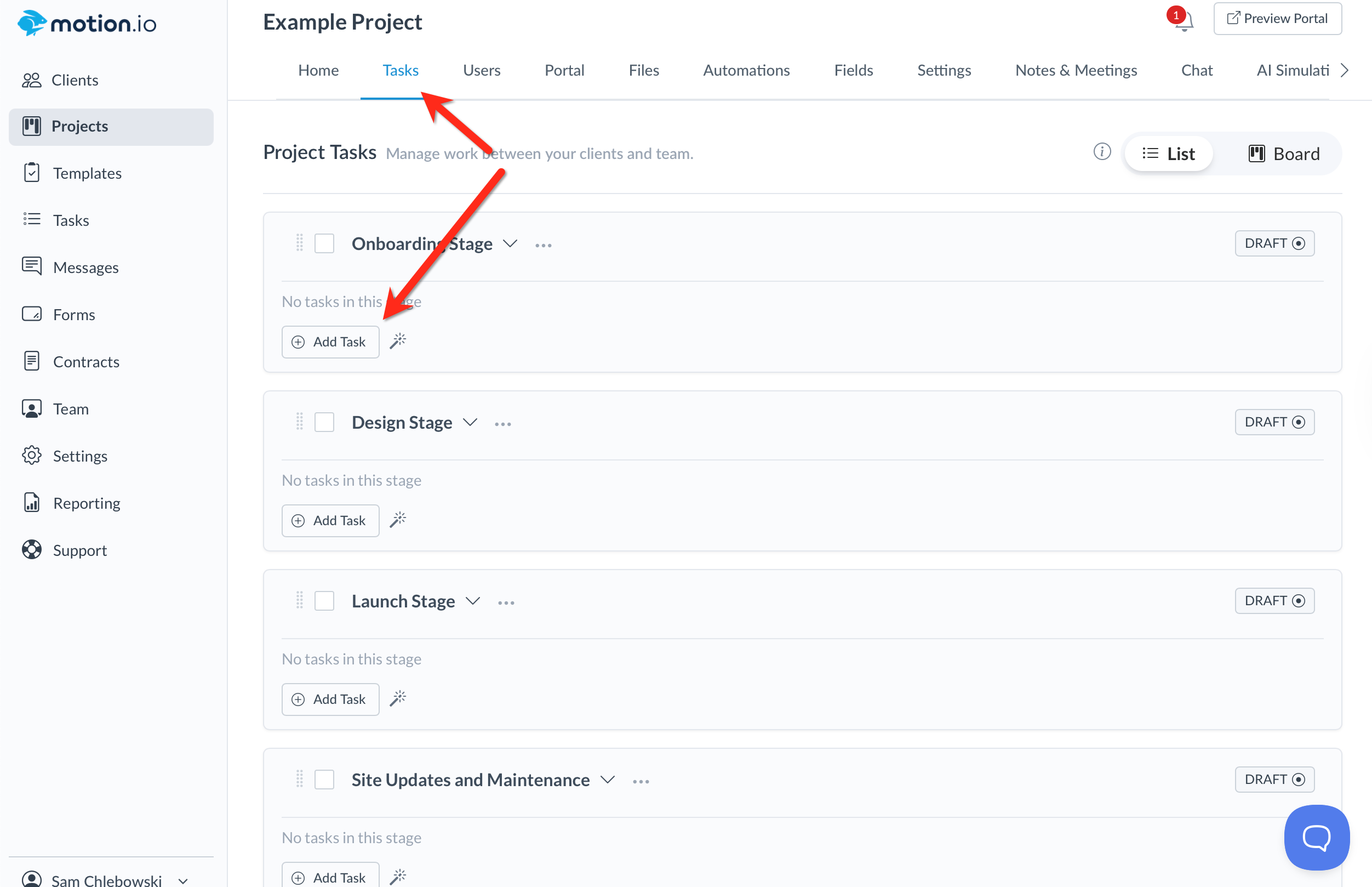 ๐ Tip: On the Tasks page, you can create tasks and group them into stages โ for example, onboarding, delivery, and offboarding โ to help your clients visualize the steps of a project. Click here to learn more.
