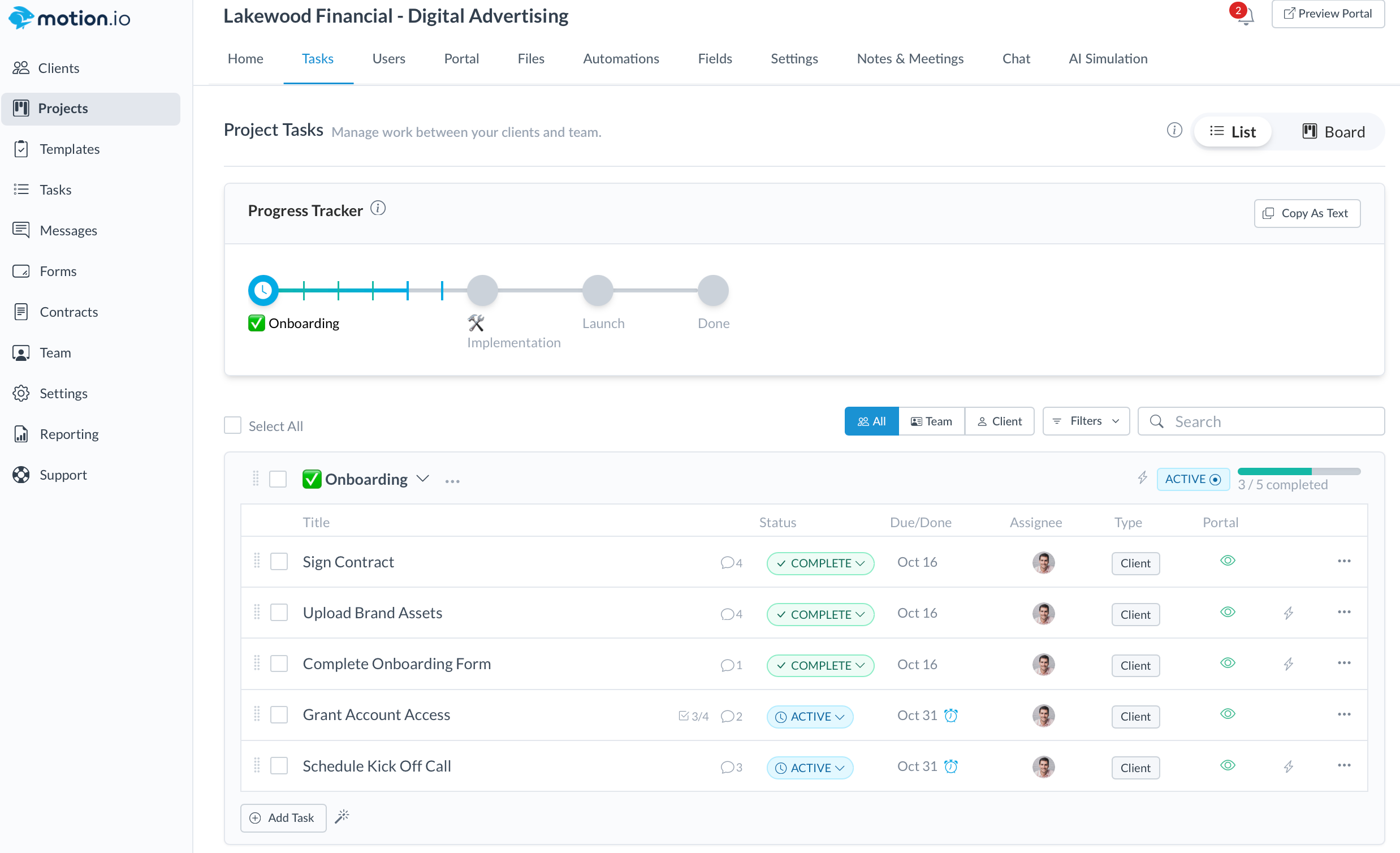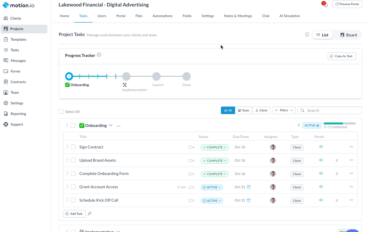 The Tasks page within your projects is the heart of project management in Motion.io. It’s where you’ll create tasks, organize them into stages, and set up automations that streamline your client work. As projects progress, the Tasks page provides a clear, centralized workspace for your team to manage both internal and client-facing tasks—making collaboration smoother, roadblocks easier to identify, and progress easier to maintain.
