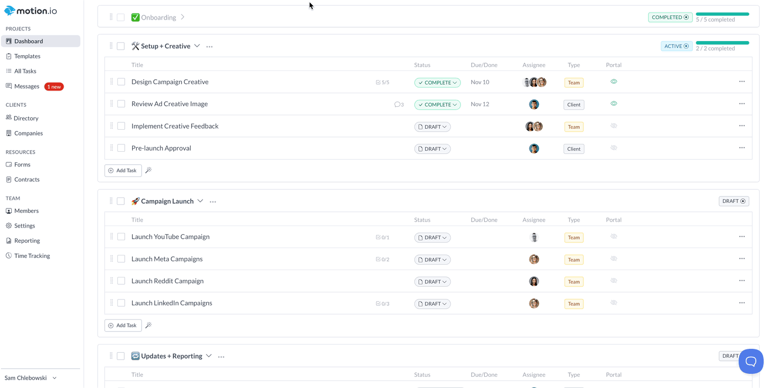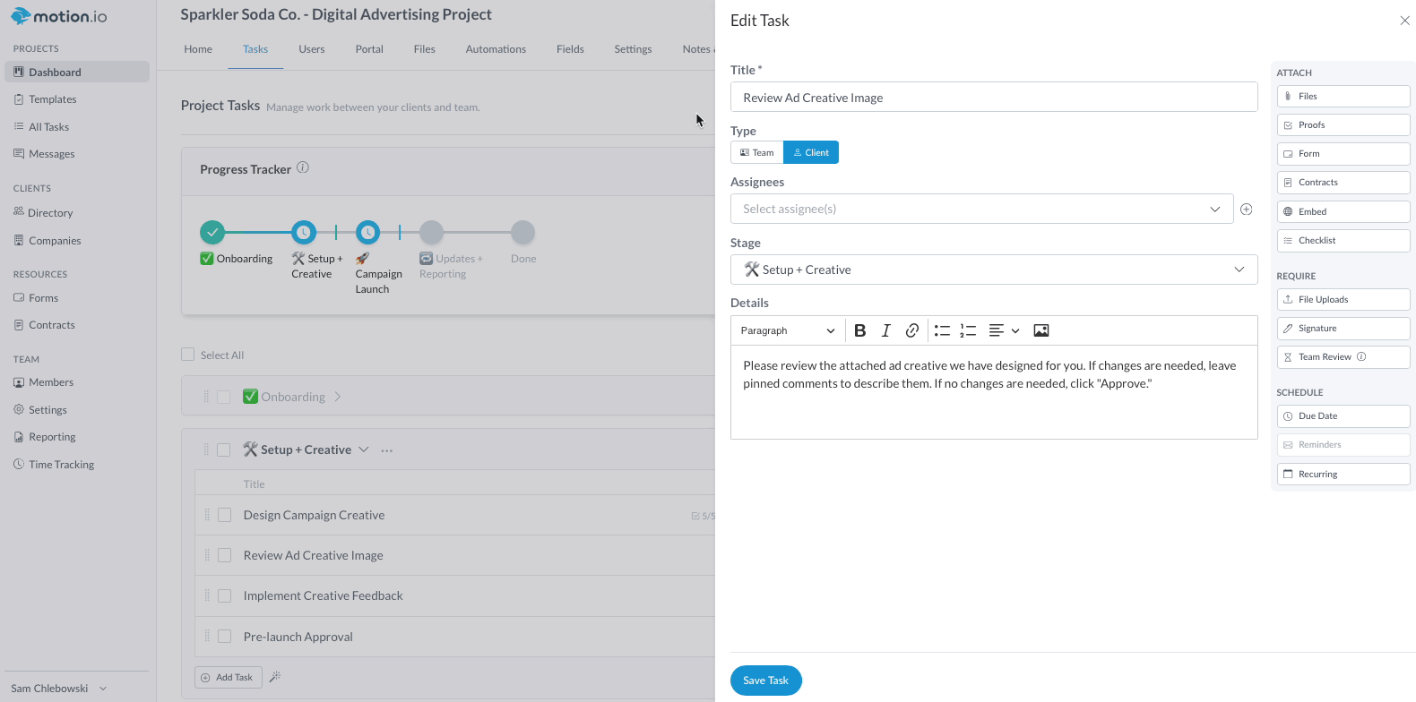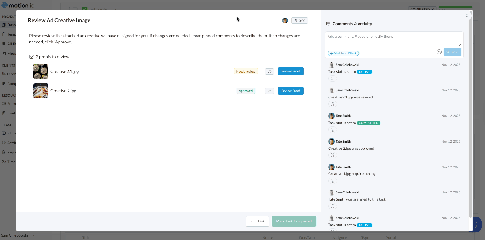 If a client requests edits, Motion.io makes it easy to keep everything organized. You don’t need to create a new task—just update the existing one with a new file version.