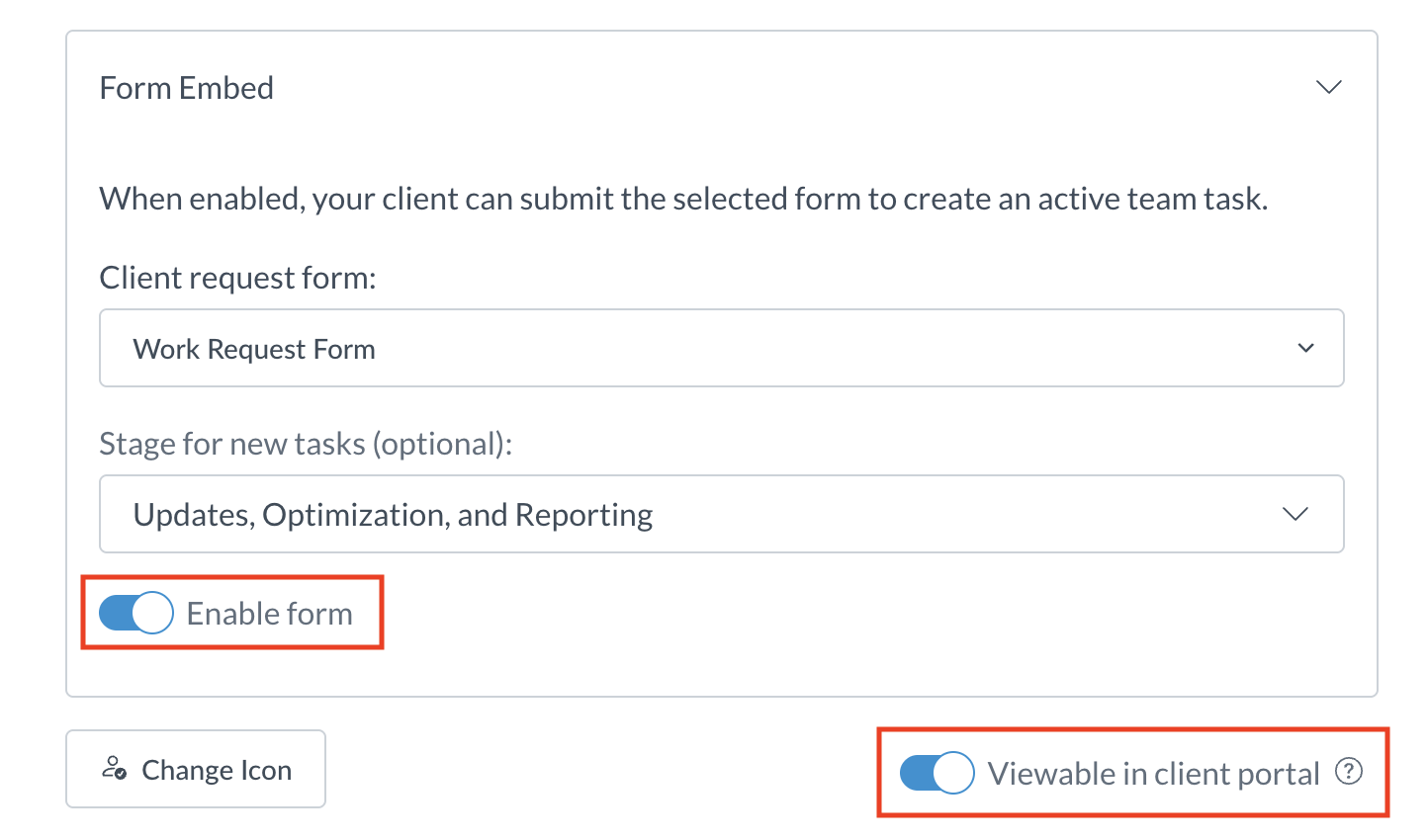 Client Request Forms can be added alongside any other editable content in a Portal Tab, such as a tab description or additional embeds. Once your form is configured, click “Enable Form” to allow clients to submit it when they access the page. Then, select “Viewable in client portal” to make the form visible and accessible to your clients.
