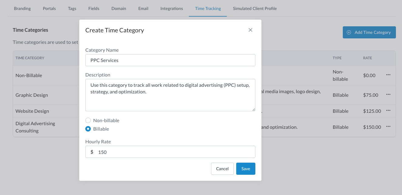 - Admins Only: Can create and manage Time Categories, which define billable status and hourly billing rates.