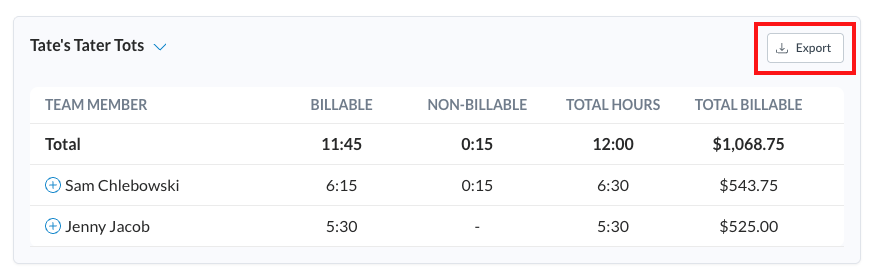 To simplify record keeping or share data externally, admins can also export Time Tracking reports on a per-project basis by selecting the Export button in the upper-right corner of the project view.