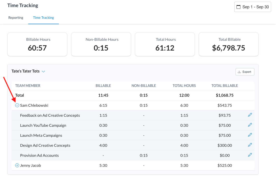 Each project shows a breakdown of the time logged by individual team members, making it easy to see contributions at a glance. For deeper insight, clicking the “+” icon expands the view to reveal exactly how much time each team member spent completing individual tasks.