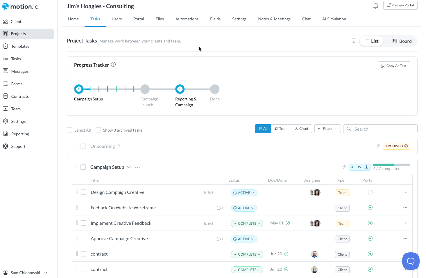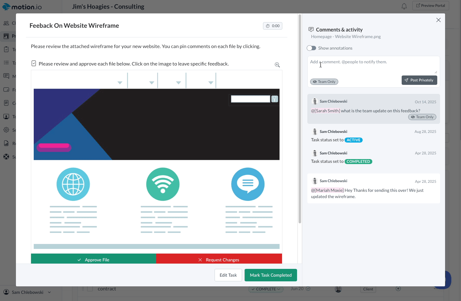 Motion.io’s Public and Private Comments feature gives your team a flexible way to manage client communication and internal collaboration—all in one place. Now, you can leave private, team-only notes directly on client tasks, right alongside the client-facing thread. This helps you keep context where it belongs, avoid side channels like email or Slack, and ensure clients only see what’s meant for them.