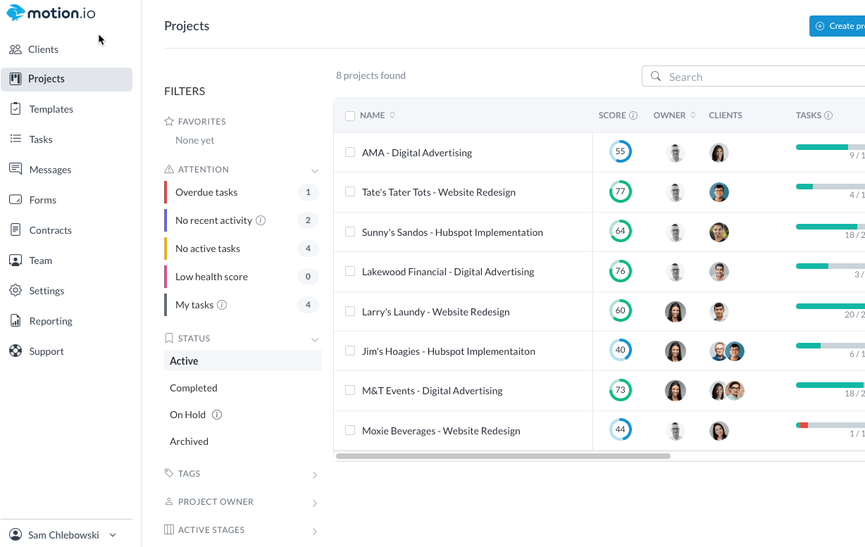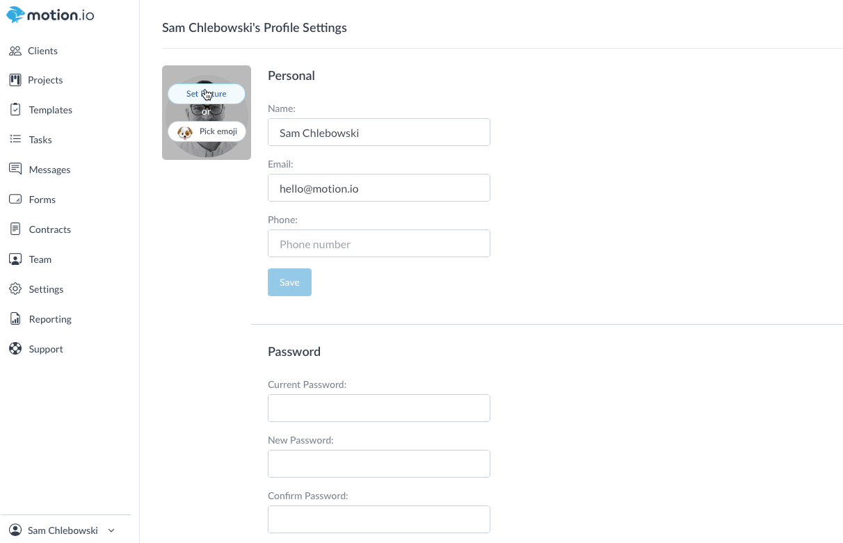 Keeping your Motion.io profile up to date helps personalize your workspace and maintain clear communication across your team and clients. Your profile settings allow you to update your display name, contact information, and profile picture—the image that appears next to your comments, messages, and task assignments.
