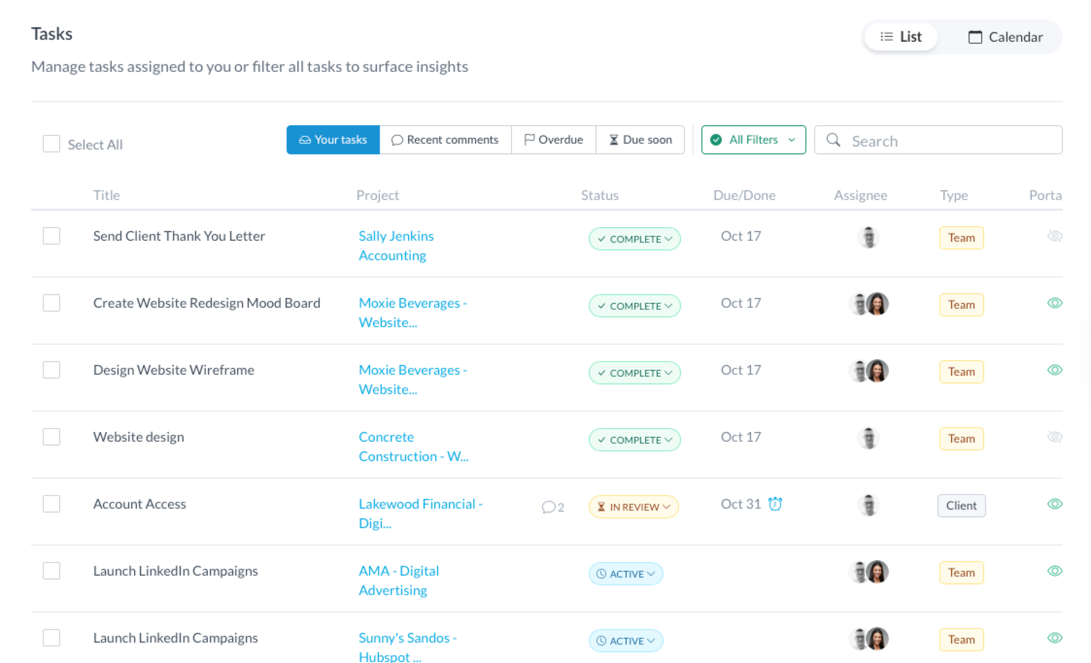 By default, you'll see a list of all your assigned active, incomplete & in review tasks sorted by due date. Each task row offers key information at a glance—including the project it belongs to, the task name, due date, portal visibility, and status.