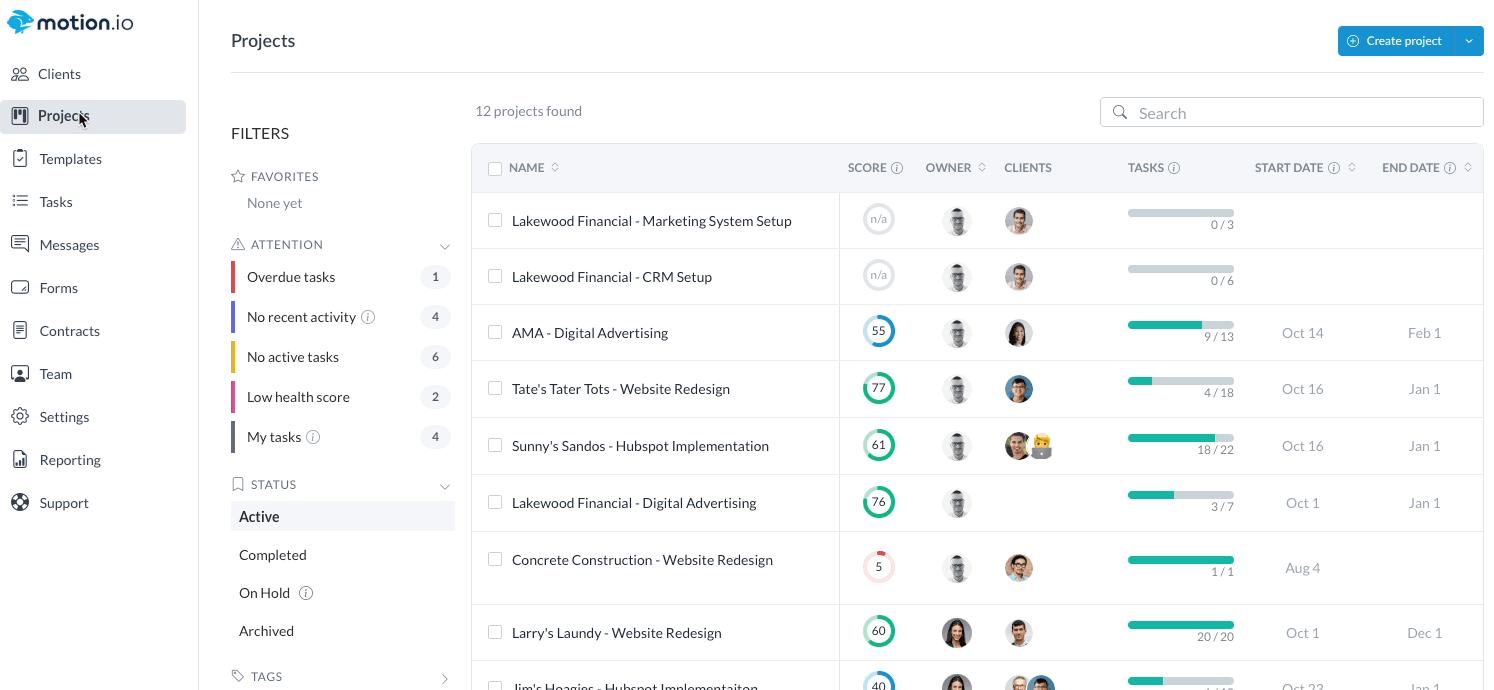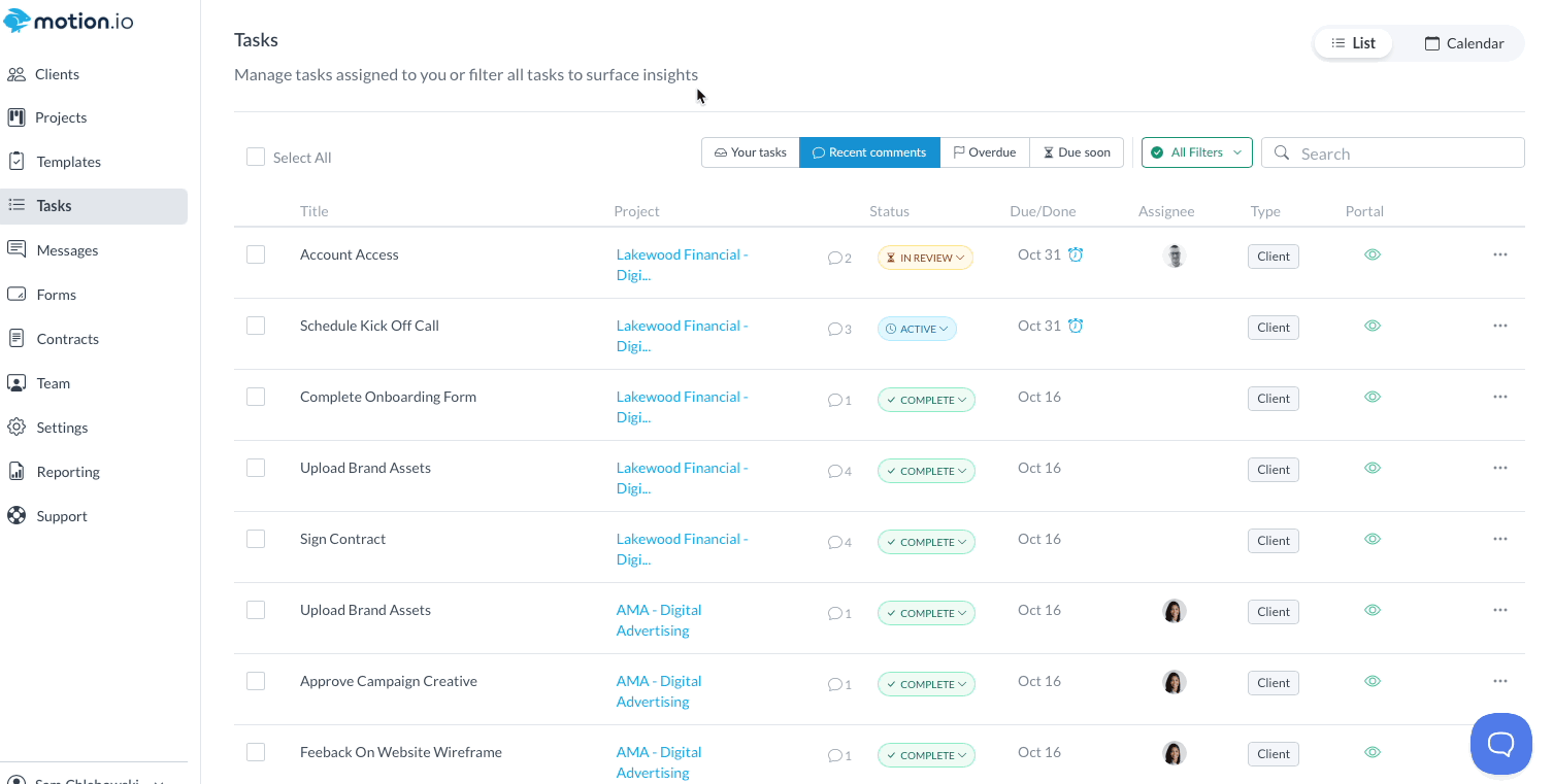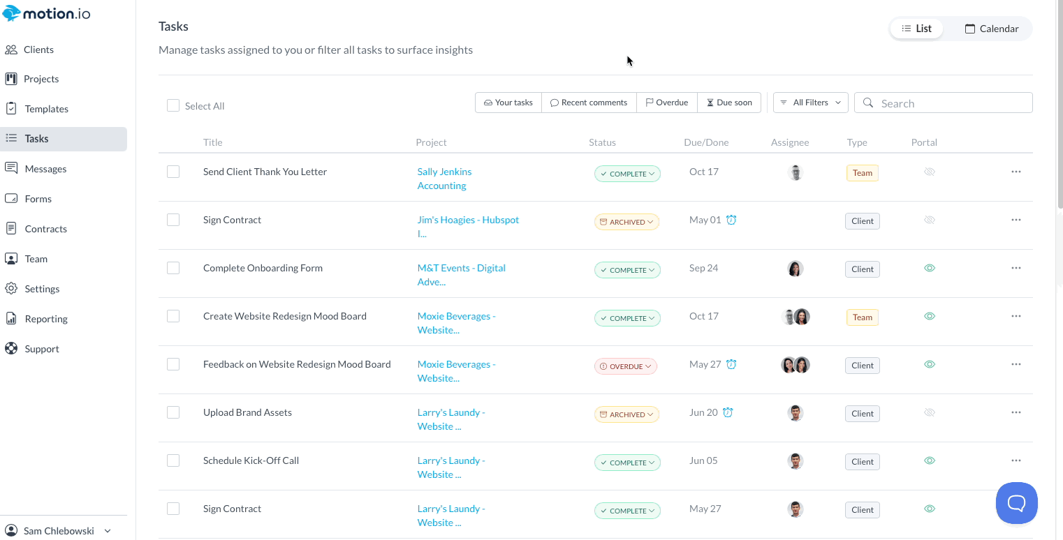 To access your Task Dashboard, click "Tasks" in the left sidebar menu of your Motion.io account.