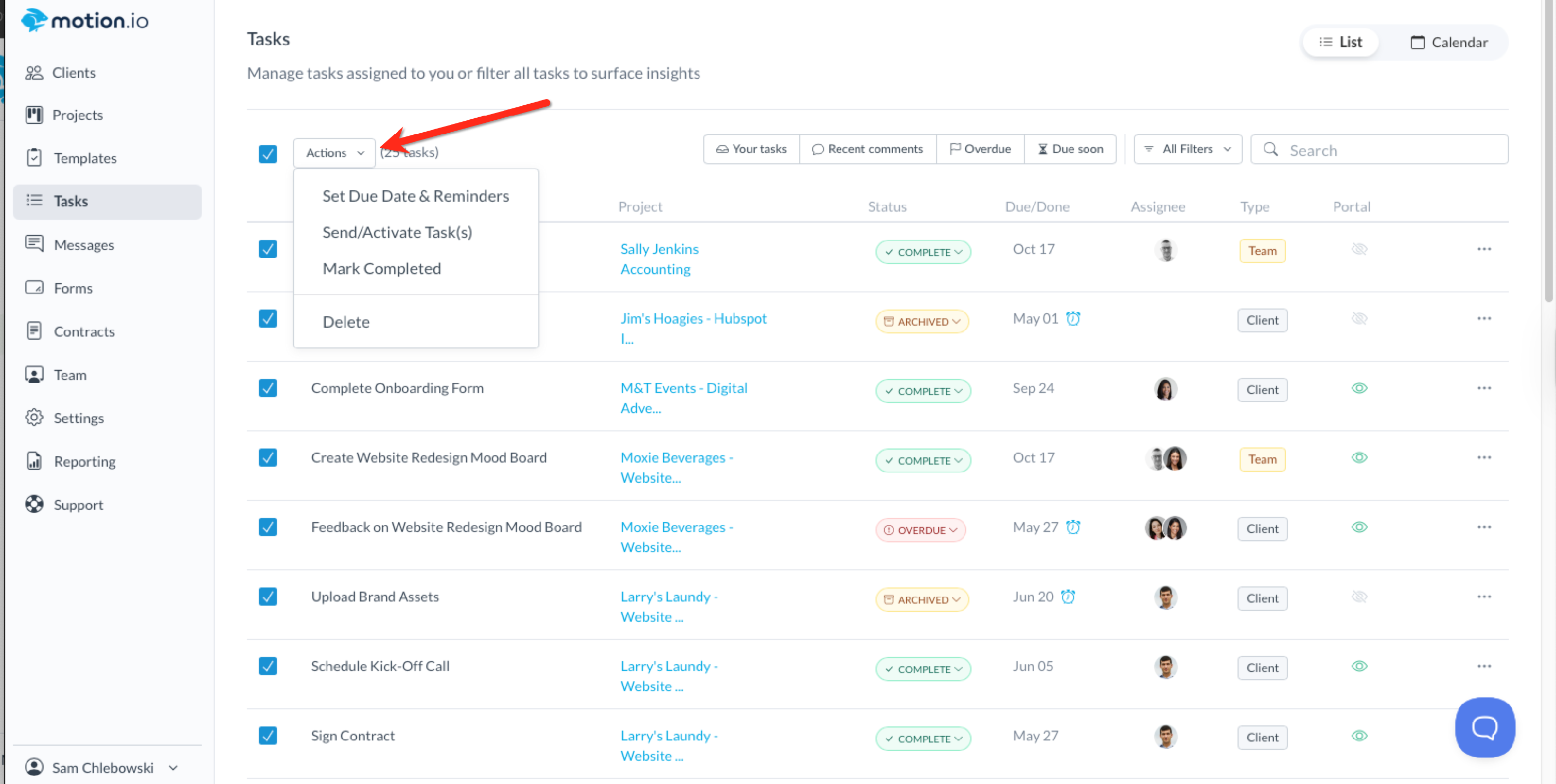 The Task Dashboard supports bulk actions so you can manage multiple tasks at once. Select multiple tasks and choose to mark them complete, active, or set due dates & reminders. These bulk actions help save time when making sweeping updates across your task list.