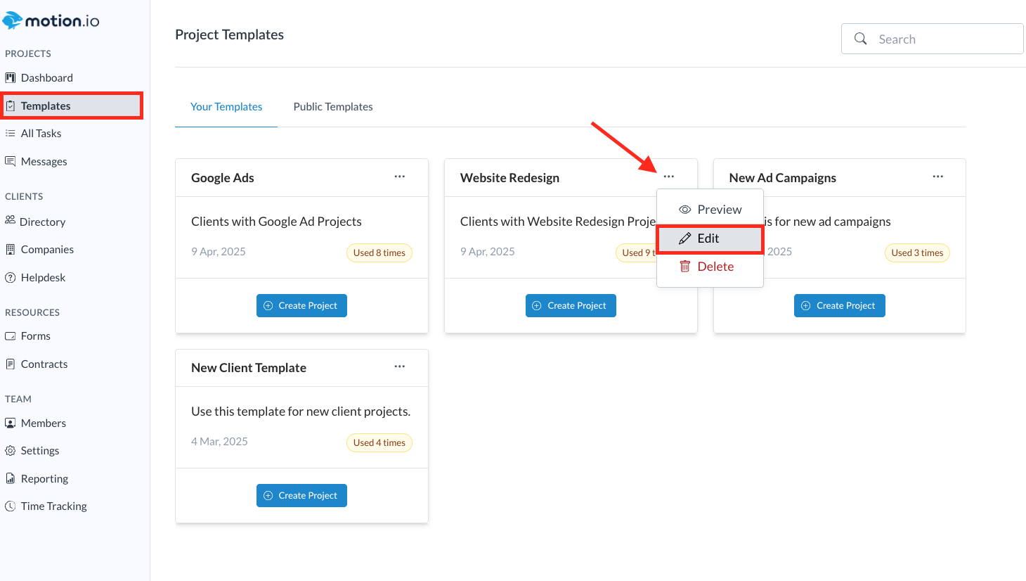 In your Motion.io account, click "Templates" from the sidebar on the left. In the "Your Templates" tab, open the actions dropdown by clicking the three dots in the upper right corner and select "Edit" from the actions.