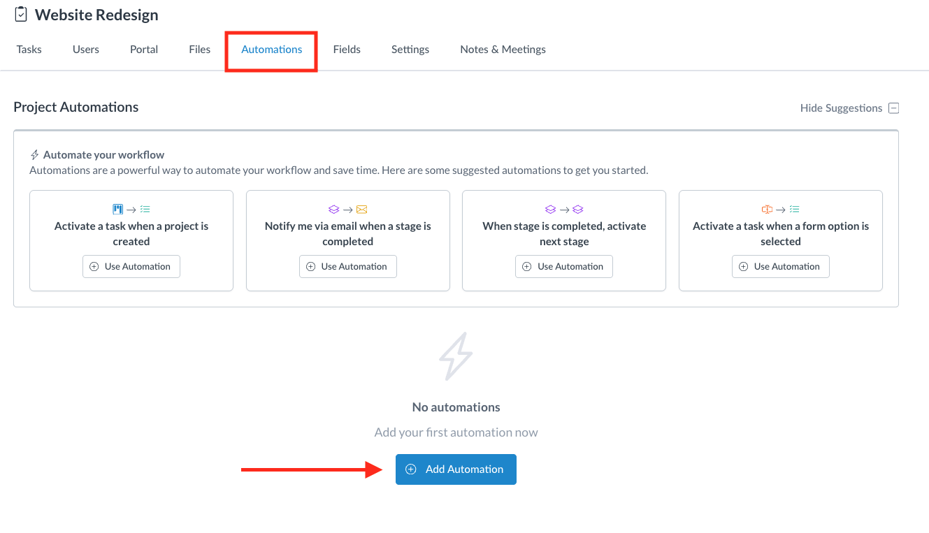 📣 Note: The instructions below walk you through adding an automation to a template. To add an automation to a project, access the Automation page for a project and proceed from step 2.