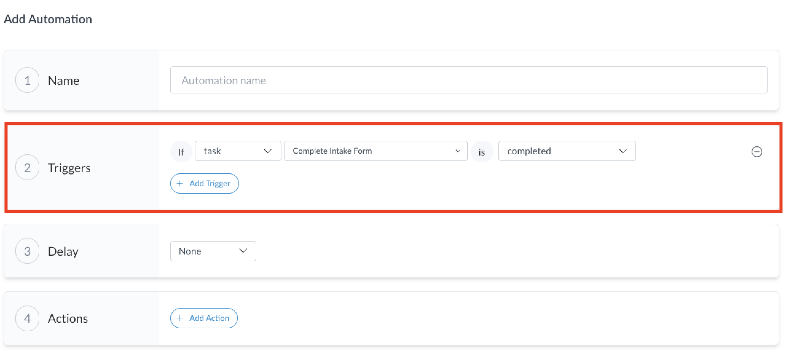 In Step 2, "Triggers", select "Task" in the first drop-down, then "Complete Intake Form", then "Completed".
