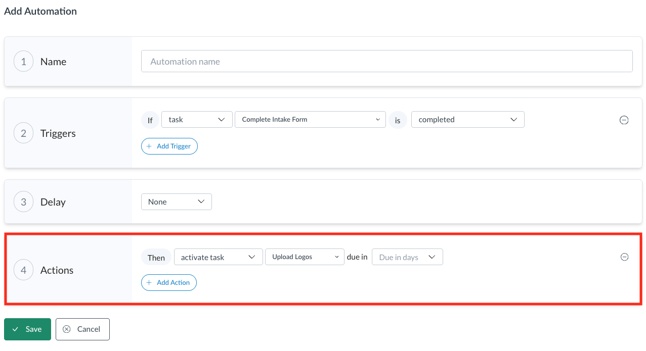 👋 Tip: You can add a delay in Step 3. The task will not activate until the delay is completed, which can be set for a number of hours, days, weeks or months.