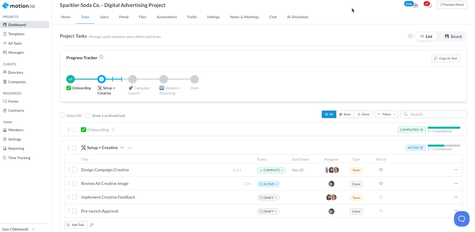 Motion.io’s AI Navigator is an AI-powered assistant designed to help teams manage projects faster and more efficiently. With AI Navigator, you can quickly understand where a project stands, identify potential roadblocks, and get smart recommendations on what to do next—without digging through tasks or messages manually.
