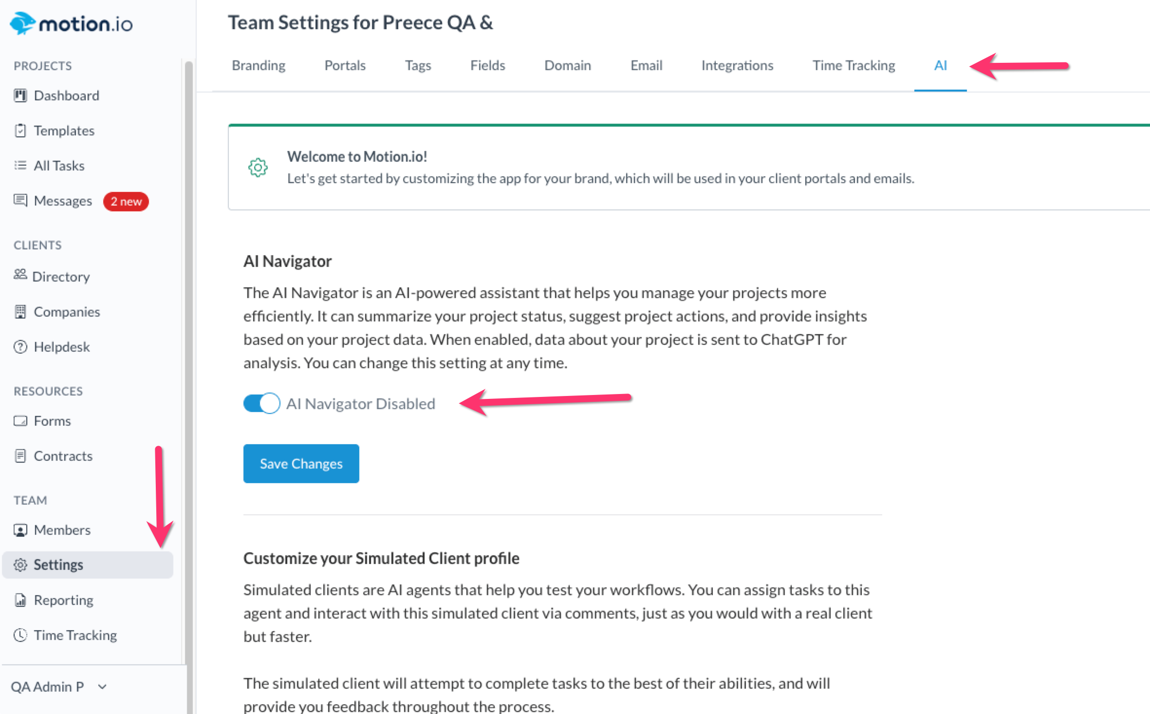 AI Navigator is automatically enabled for all included plans. To disable it, access the AI Team Settings and toggle the "Disabled" option "On".