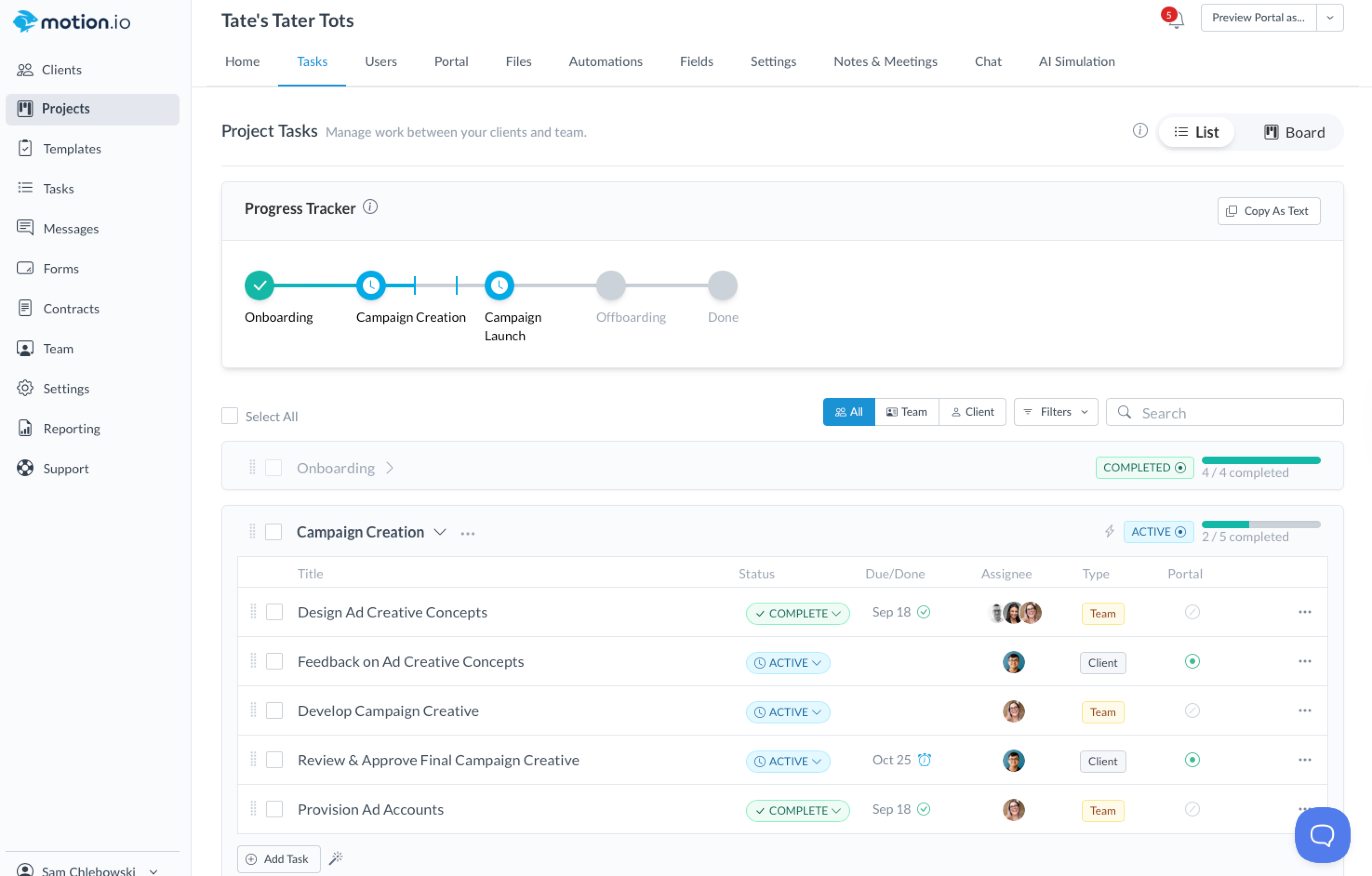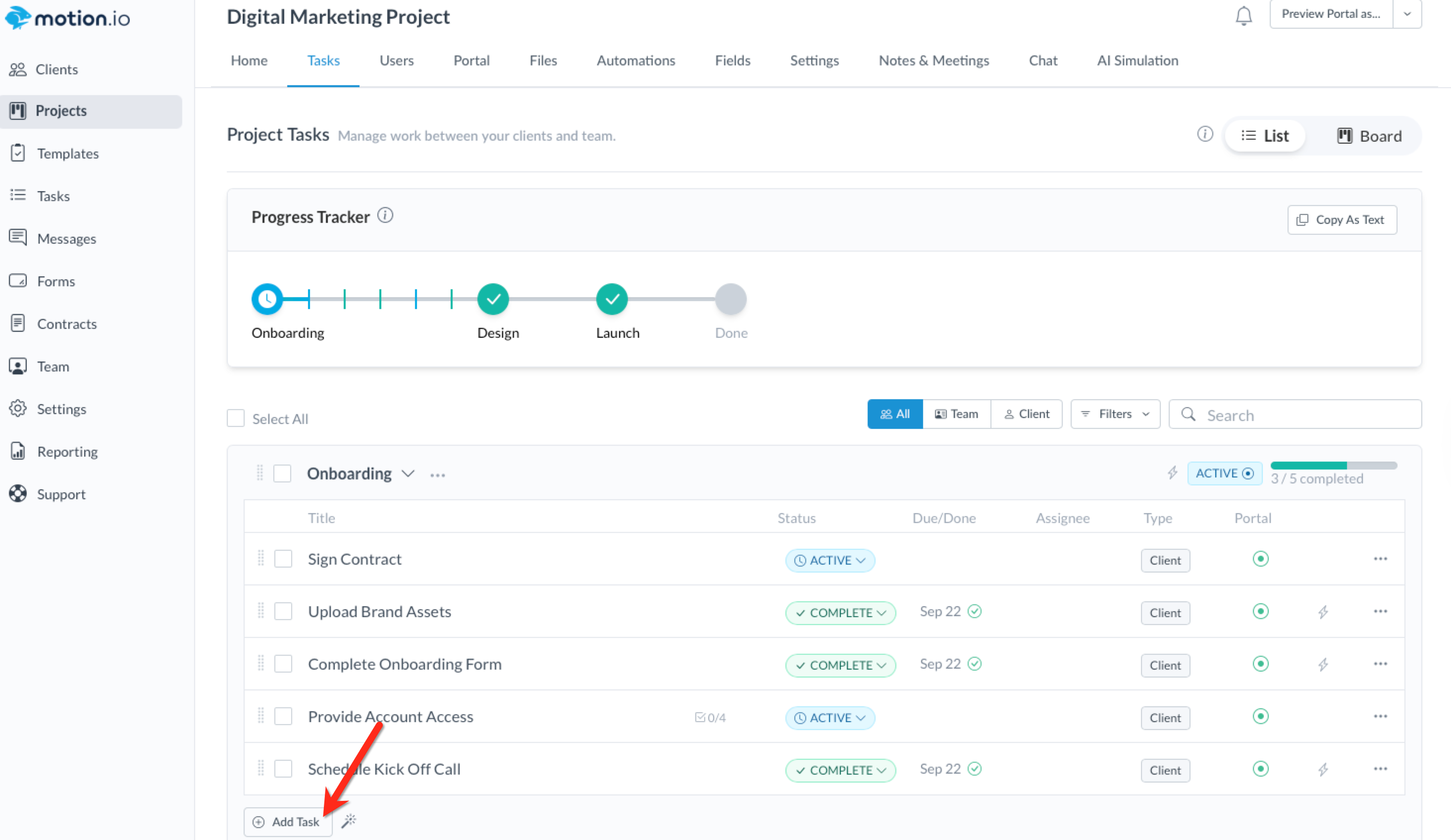 Within your Motion.io projects, tasks you create and assign to clients will appear on the Tasks page of their portals. Whenever you create a client task, you can set a due date and reminders to notify clients about outstanding tasks they must complete automatically.
