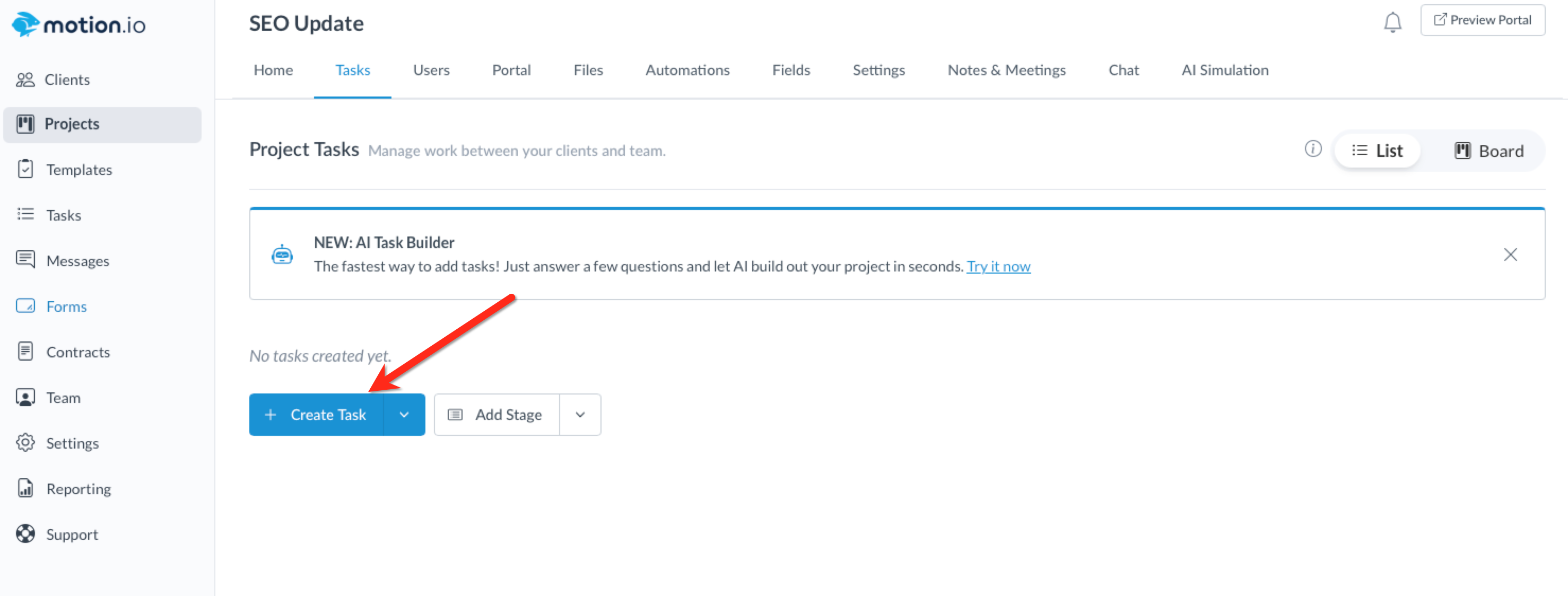 To create a client task, select a project and navigate to the Tasks page of that project. Next, click the button labeled "Create Task." When creating client tasks in a brand new project, the Create Task button will appear near the center of your screen.