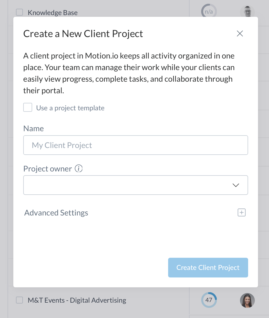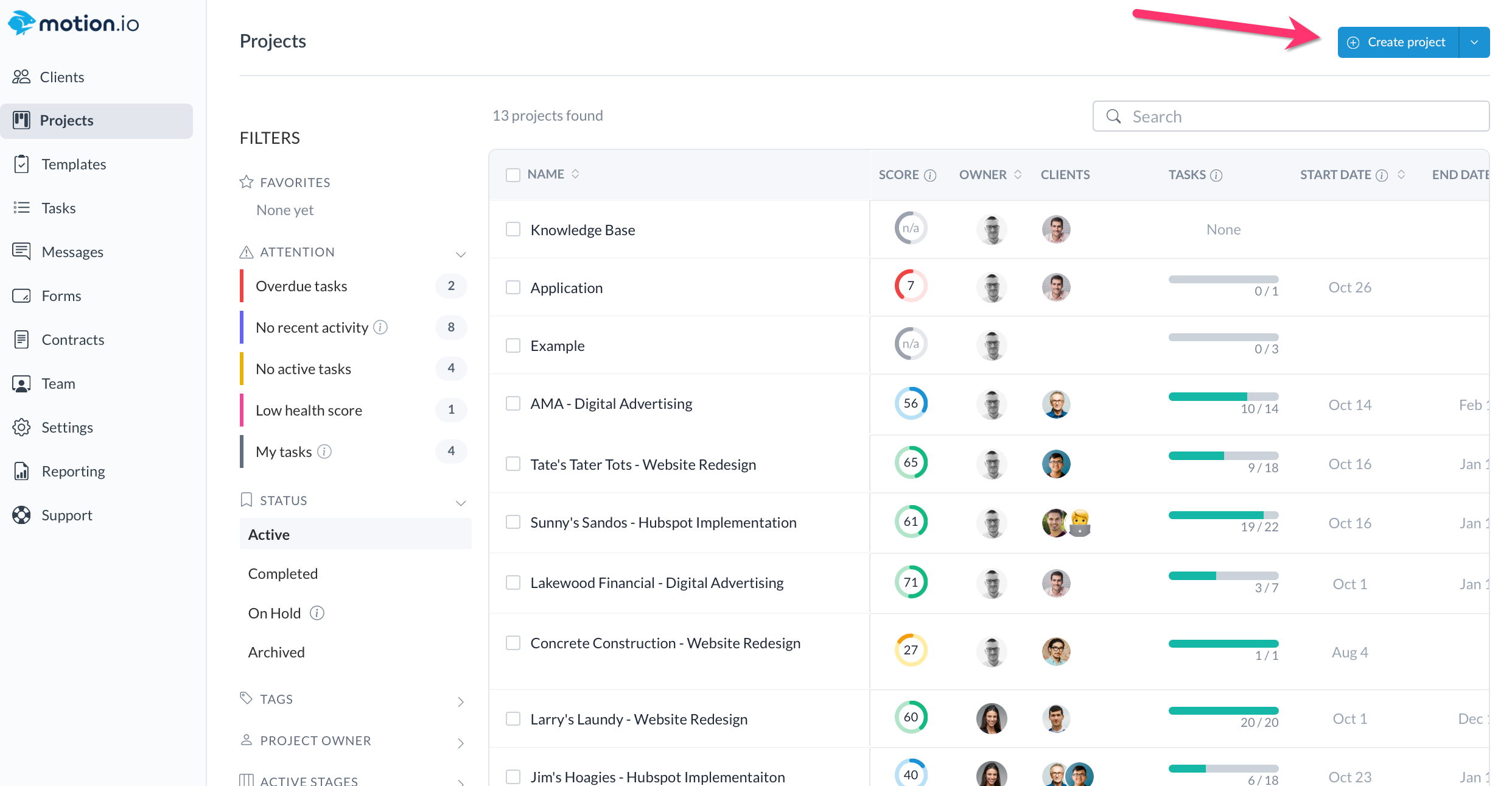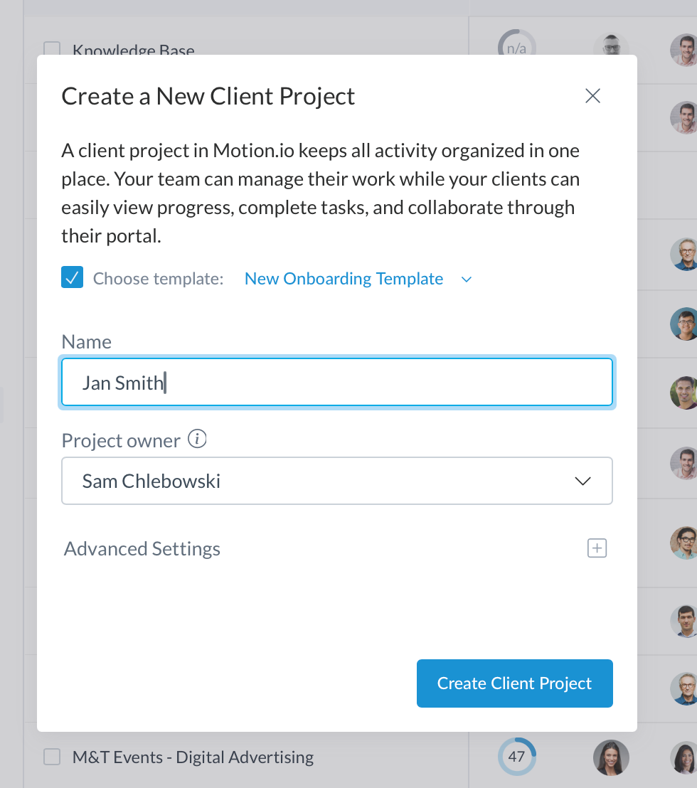 Project Templates in Motion.io allow you to further automate and streamline your onboarding process for new clients. After creating a Project Template, you can create new projects from it that will populate with all of the tasks, stages, and portal pages you need for a client project in seconds.