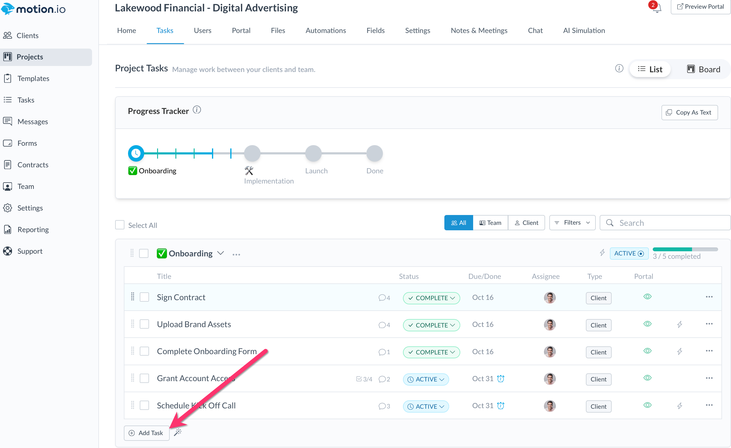 👋 Tip: In the "Tasks" tab of your Motion.io projects, any tasks set up to send automated reminders will display a clock icon next to the due date.