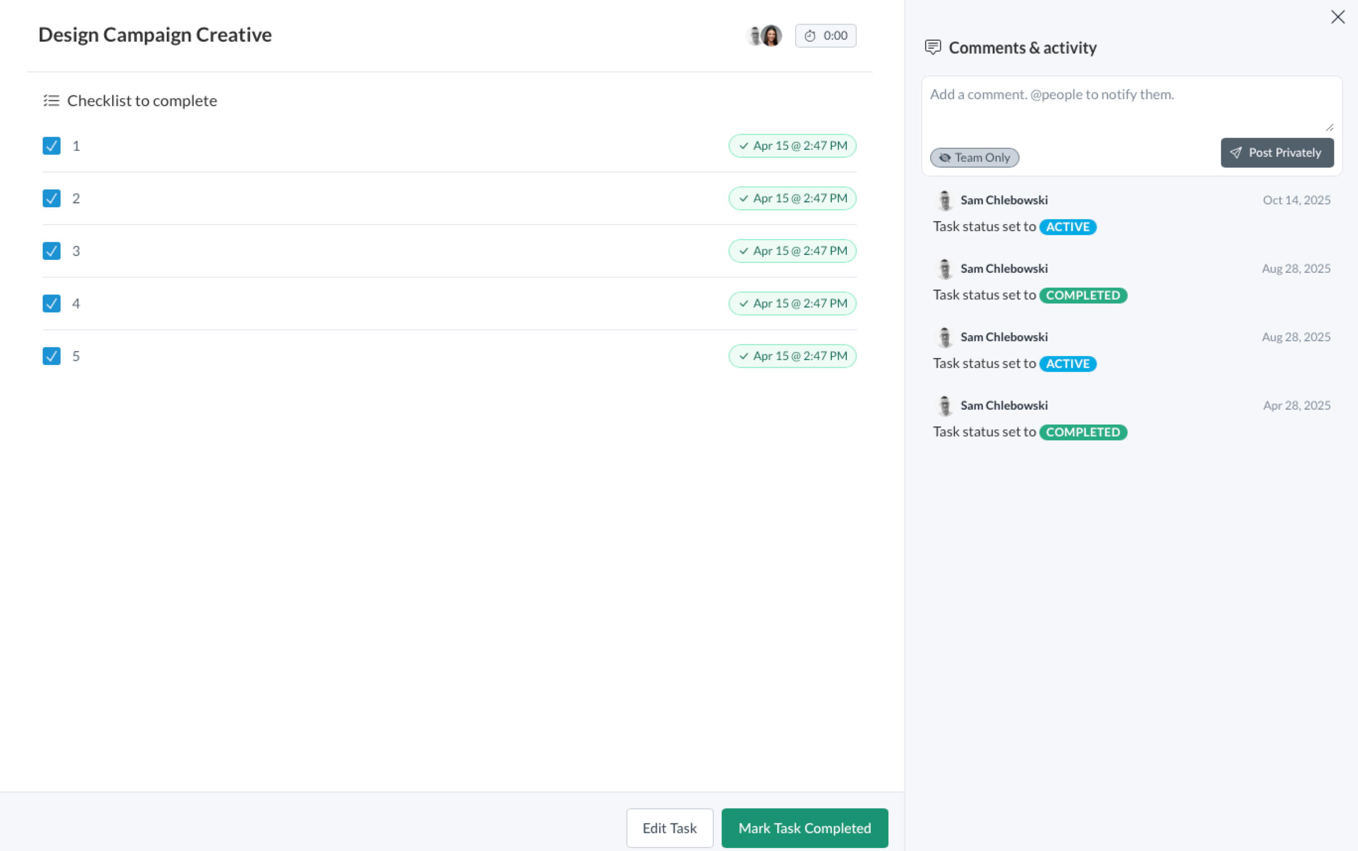 When creating a team task, you have the option to require a team review before the task is marked as complete. You can assign a reviewer from your team during Task creation or editing.