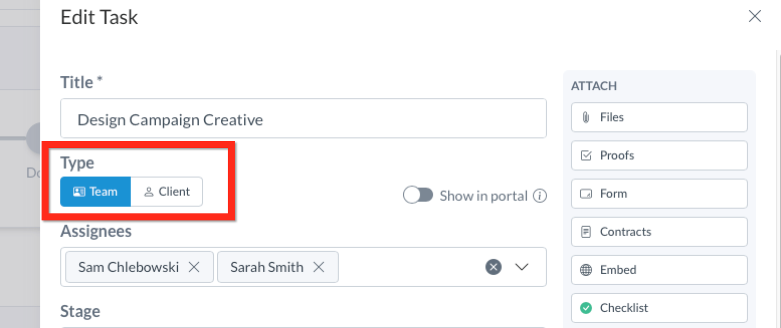 The biggest difference is Task Visibility. When a Team Task is created, it is automatically hidden from the client unless the "Show in portal" toggle is activated.