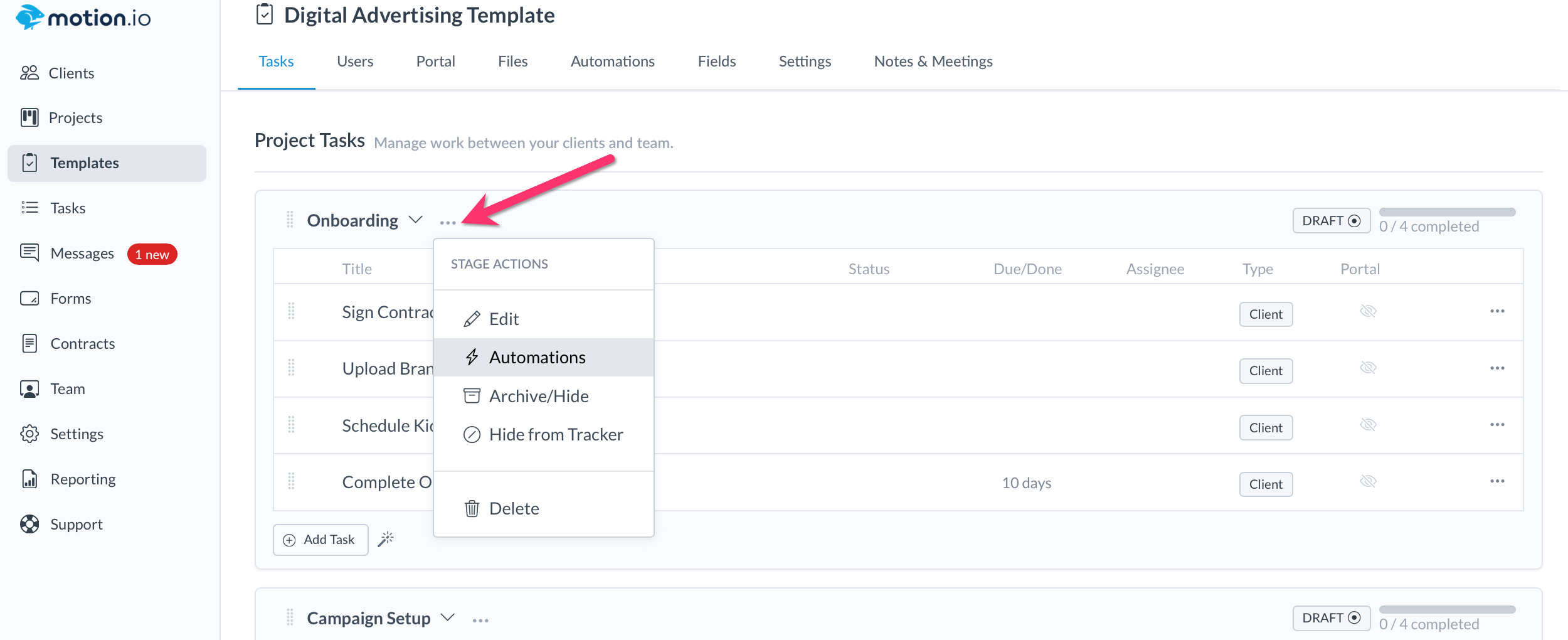 Navigate to the project stage in your template to which you'd like to add the automation. Click the three dots to the right of the Stage name, and in the dropdown, click "Automations."