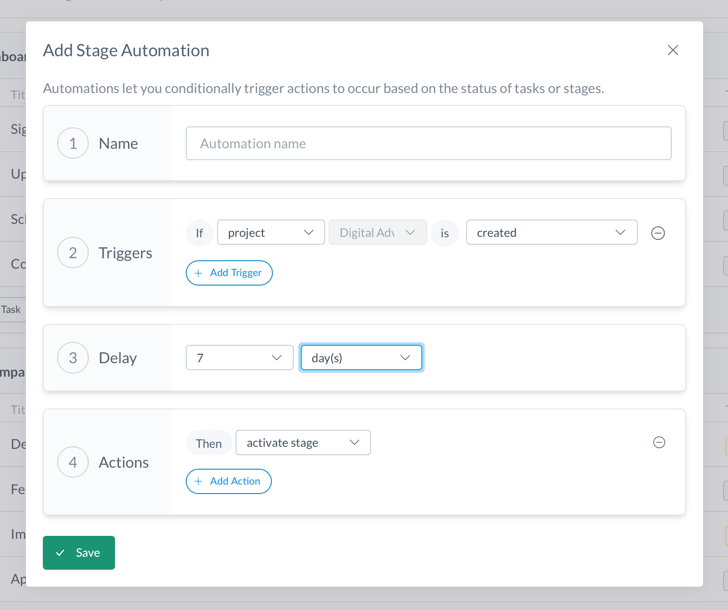 Row 3 is the optional "Delay" setting, allowing you to delay the action by a set amount of time after the Trigger. For example, if you want your stage to activate 1 week after the project is created, select "7 days" in this row.