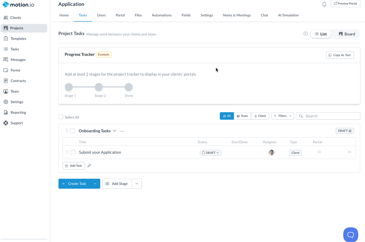 So you can create and modify client tasks in your Motion.io projects without clients seeing them until you are ready; both Client Tasks and Internal Tasks are automatically set to the "Draft" status and not visible to clients in their portals until you send them.