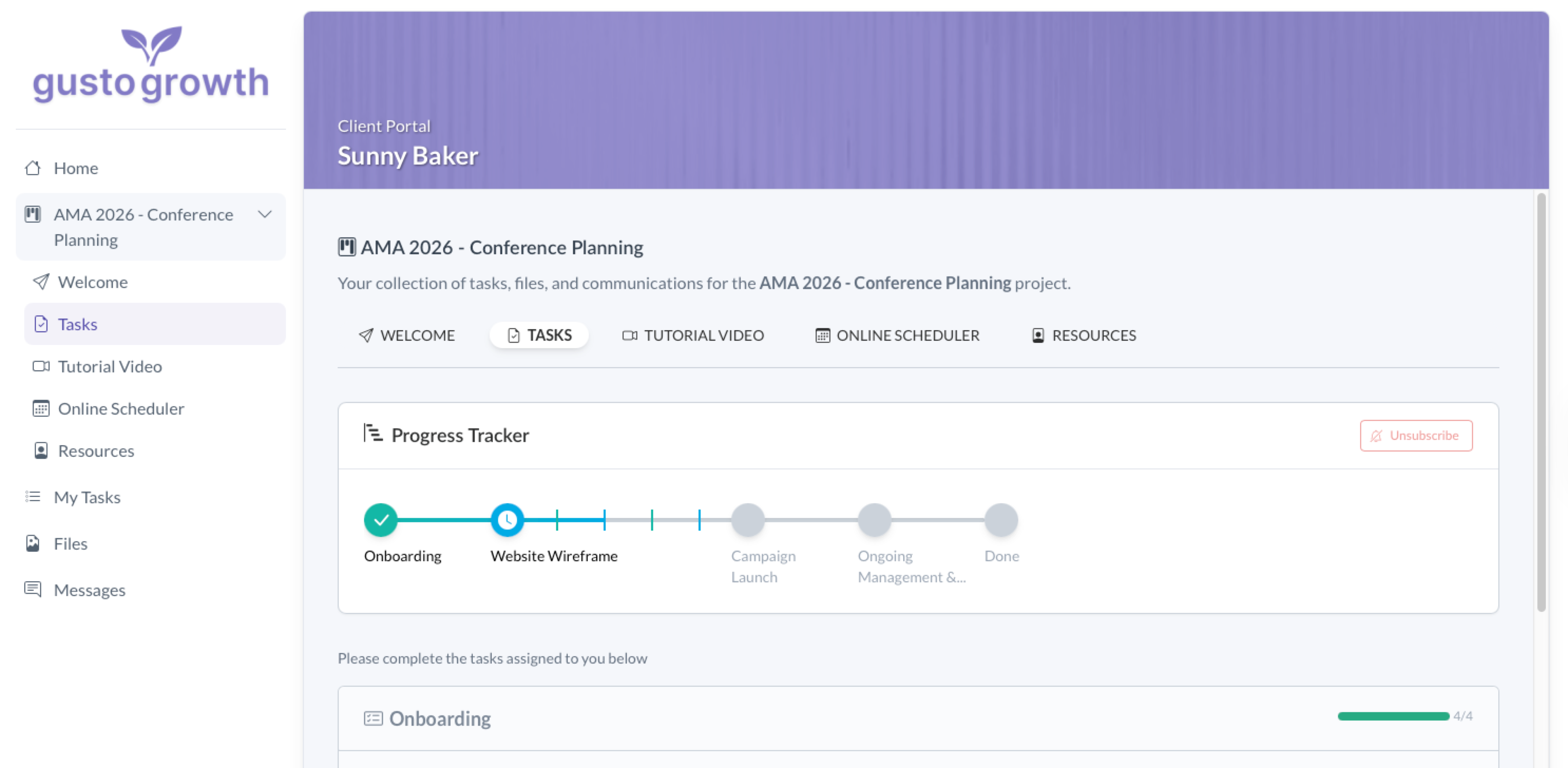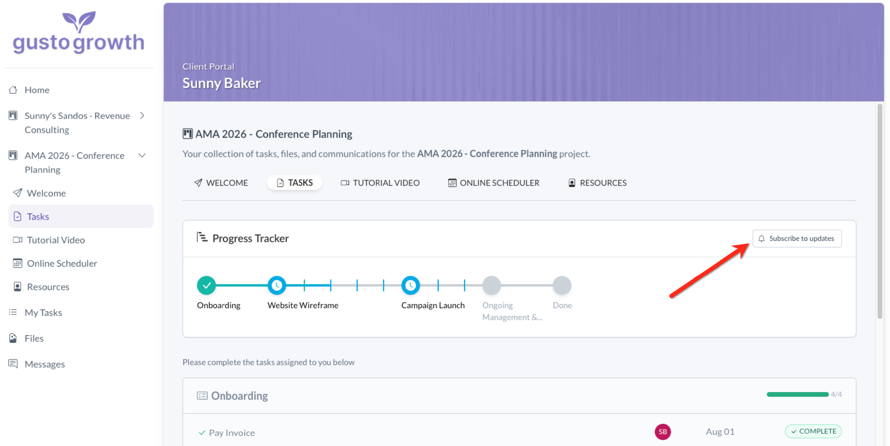 In the portal preview that opens in a new tab, click the "Tasks" page to see how the Project Progress Tracker will appear to your clients.