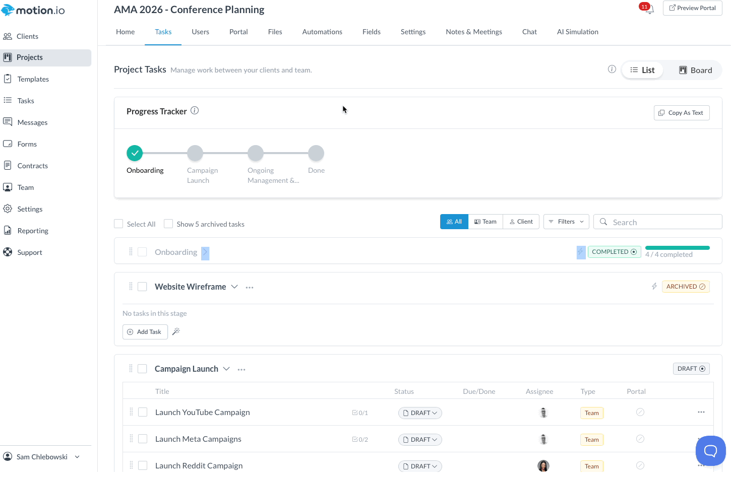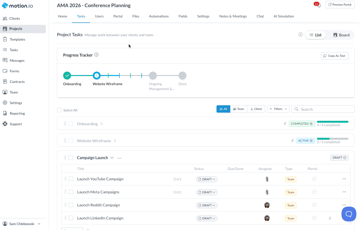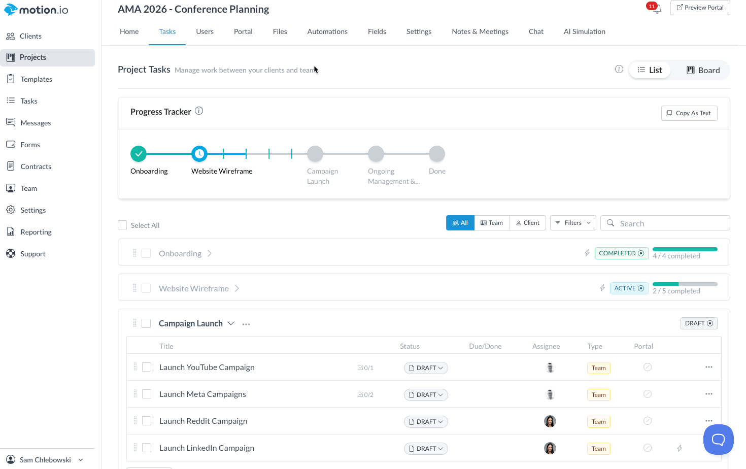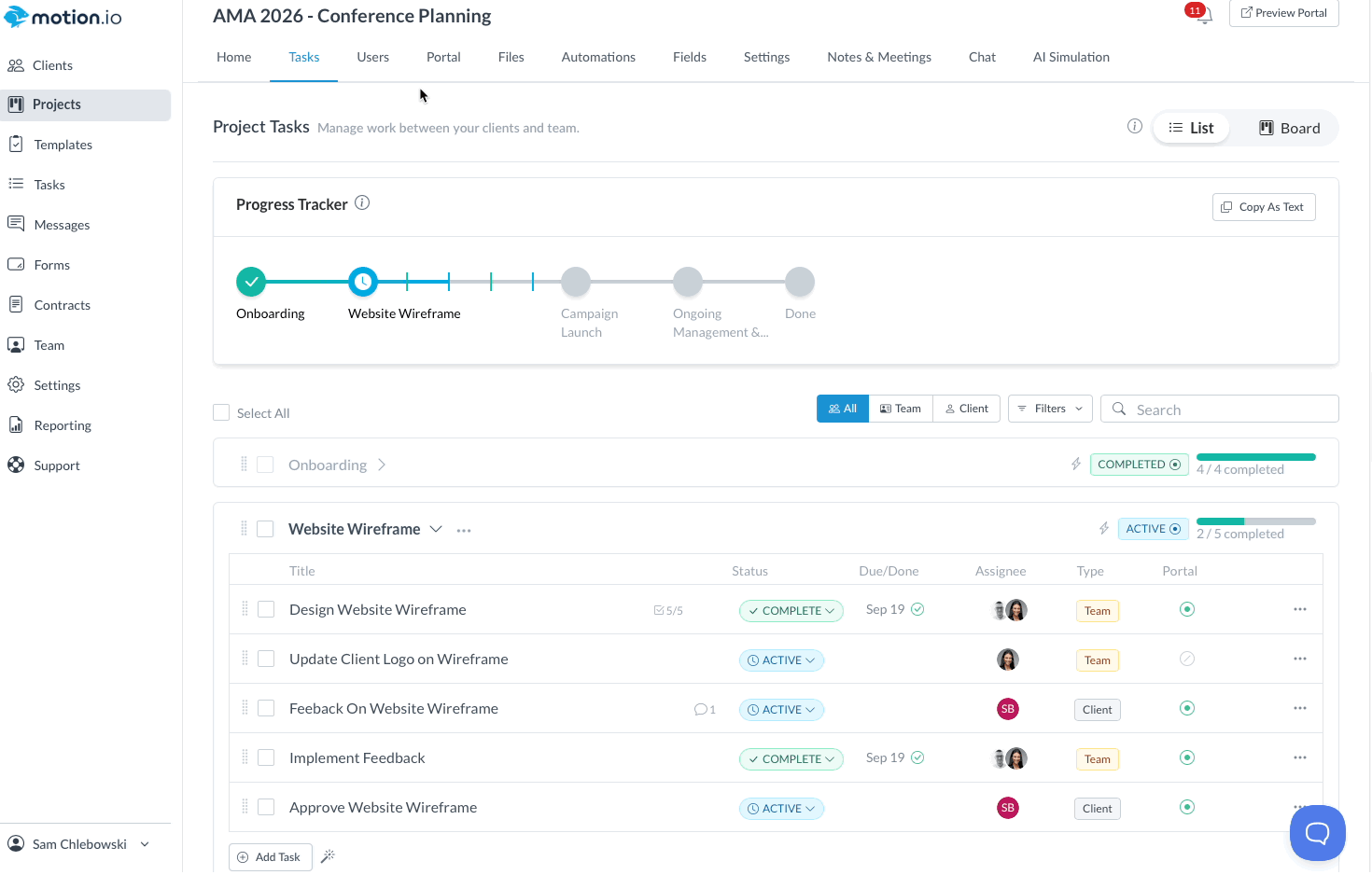 When you create a project (either from scratch or from a template), Motion.io automatically includes a Project Progress Tracker clients can access from their portal's "Tasks" page.